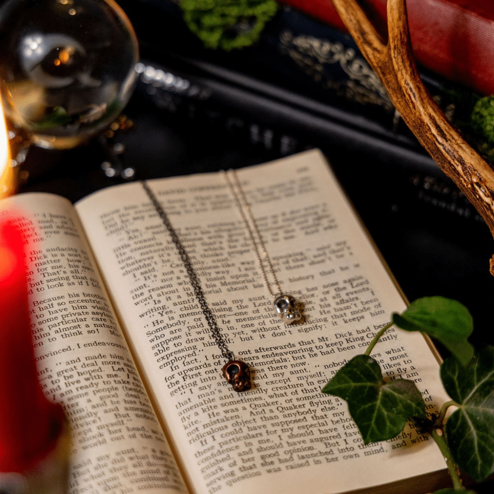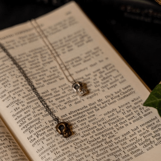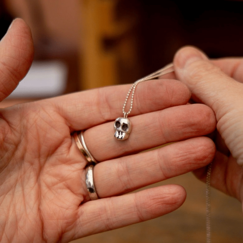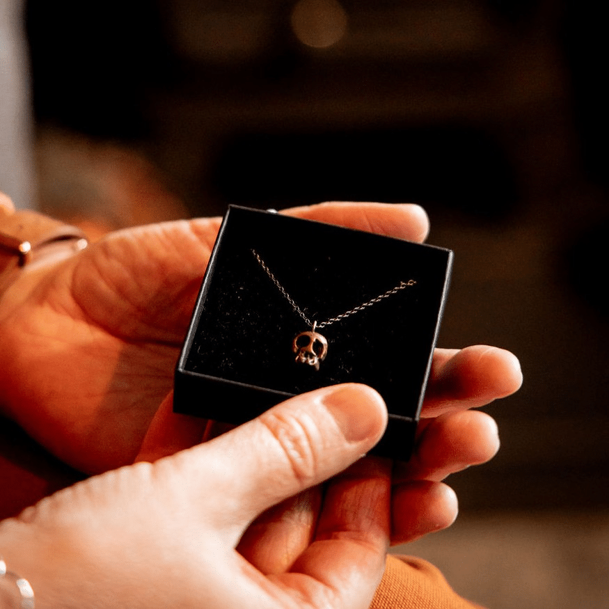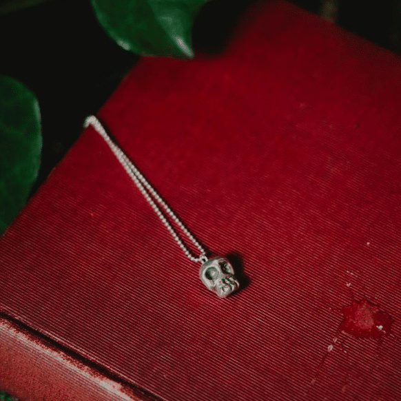 The copper skull comes with a darkly oxidised silver chain, offering a warm, earthy contrast. The silver skull is matched with a bright sterling silver chain โ€” clean, classic, and timeless.